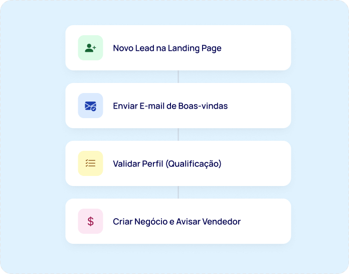 Automatize ações repetitivas do dia a dia do processo comercial e libere tempo para os times de marketing, vendas e atendimento atuar de forma mais estratégica, sem perder o controle do que acontece em cada etapa.