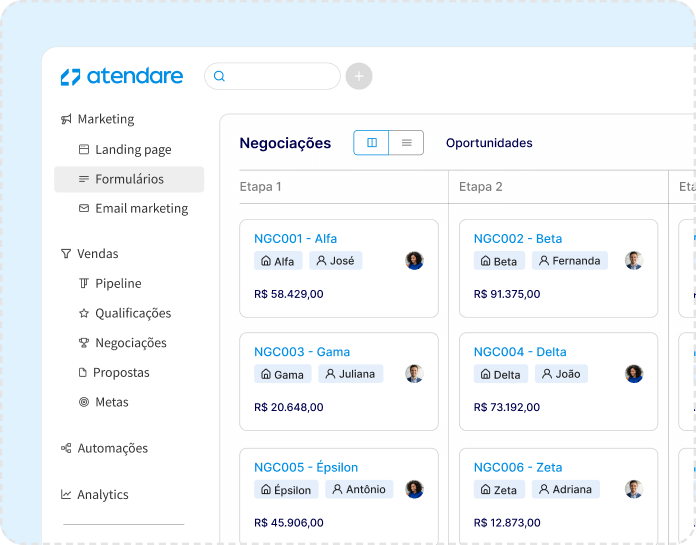 O que eu mais gosto no Atendare é a sua capacidade de centralizar várias etapas do processo: marketing, vendas e pós-venda.